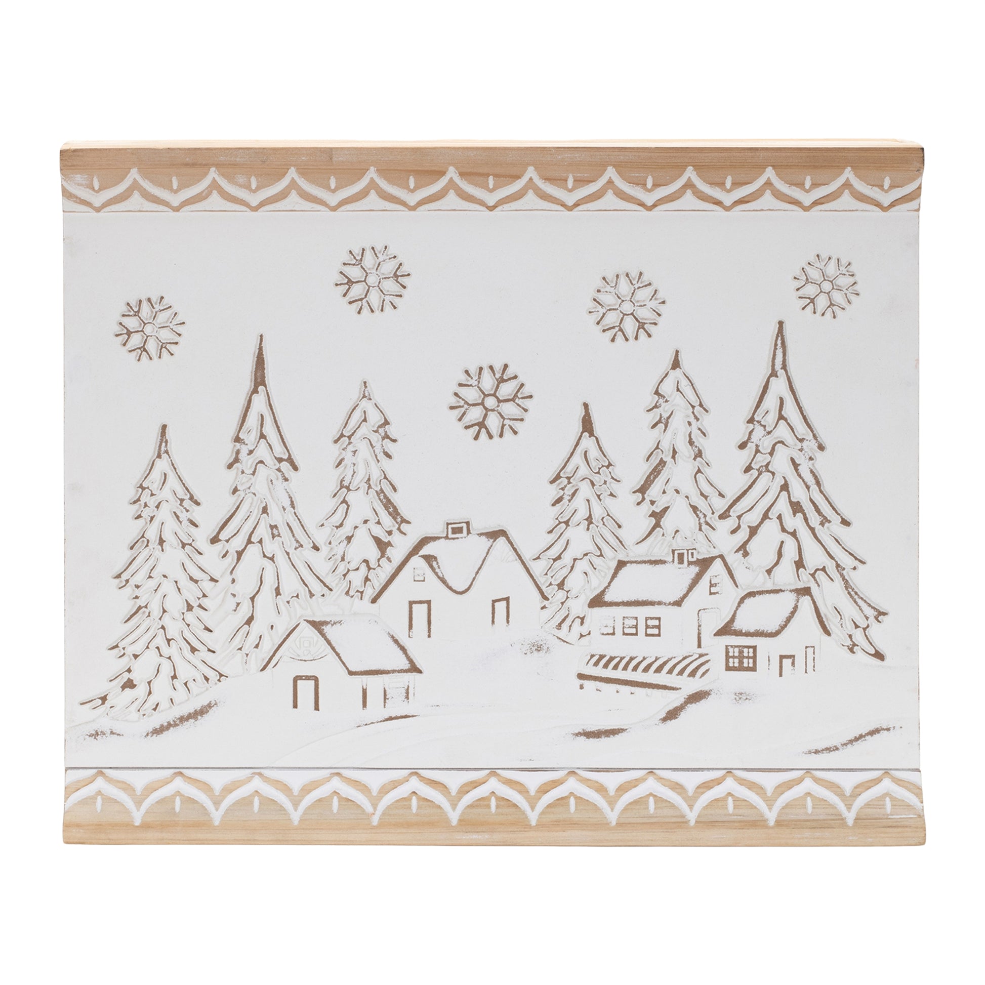 Bring the magic of a woodland winter village to your holiday decor with this Carved Wood Winter Village Wall Art. Featuring intricate carvings of snowy trees, a winter village, and delicate snowflakes, all framed with ornate detailing, this piece is perfect for adding a rustic, wintry touch to your living room or entryway. Its soft white tones and rustic wood grain accents offer a cozy yet modern vibe. The piece comes with two metal nail holes on the back for securing it safely to the wall of your home, or it makes a great gift for those who cherish the beauty of the season!