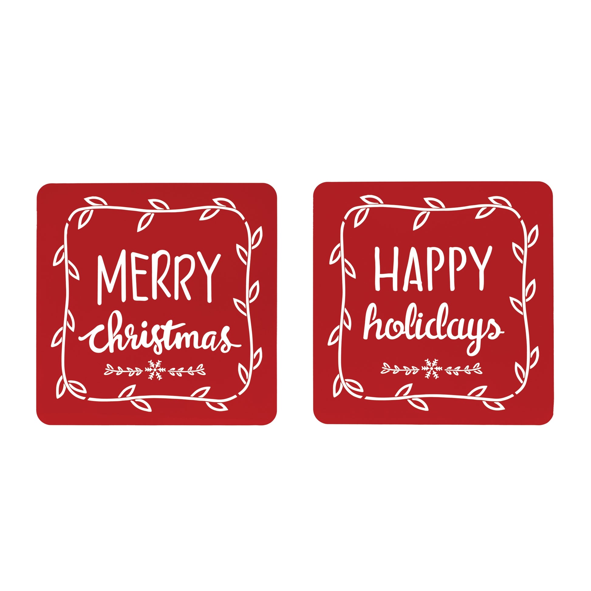 Add a festive touch to your home with this Cut Metal Holiday Sentiment Sign Set, featuring the beloved "Merry Christmas" and "Happy Holidays" sentiments. Crafted in a vibrant red tone with intricate cut sheet iron designs and delicate leaf borders, these plaques are perfect for enhancing your holiday displays. Each piece in the set comes with a sawtooth hook on the back for securing them safely to the walls of your home. Sold in a set of two assorted pieces, they’re ideal for hanging in your living room, entryway, or gifting to someone special this season.