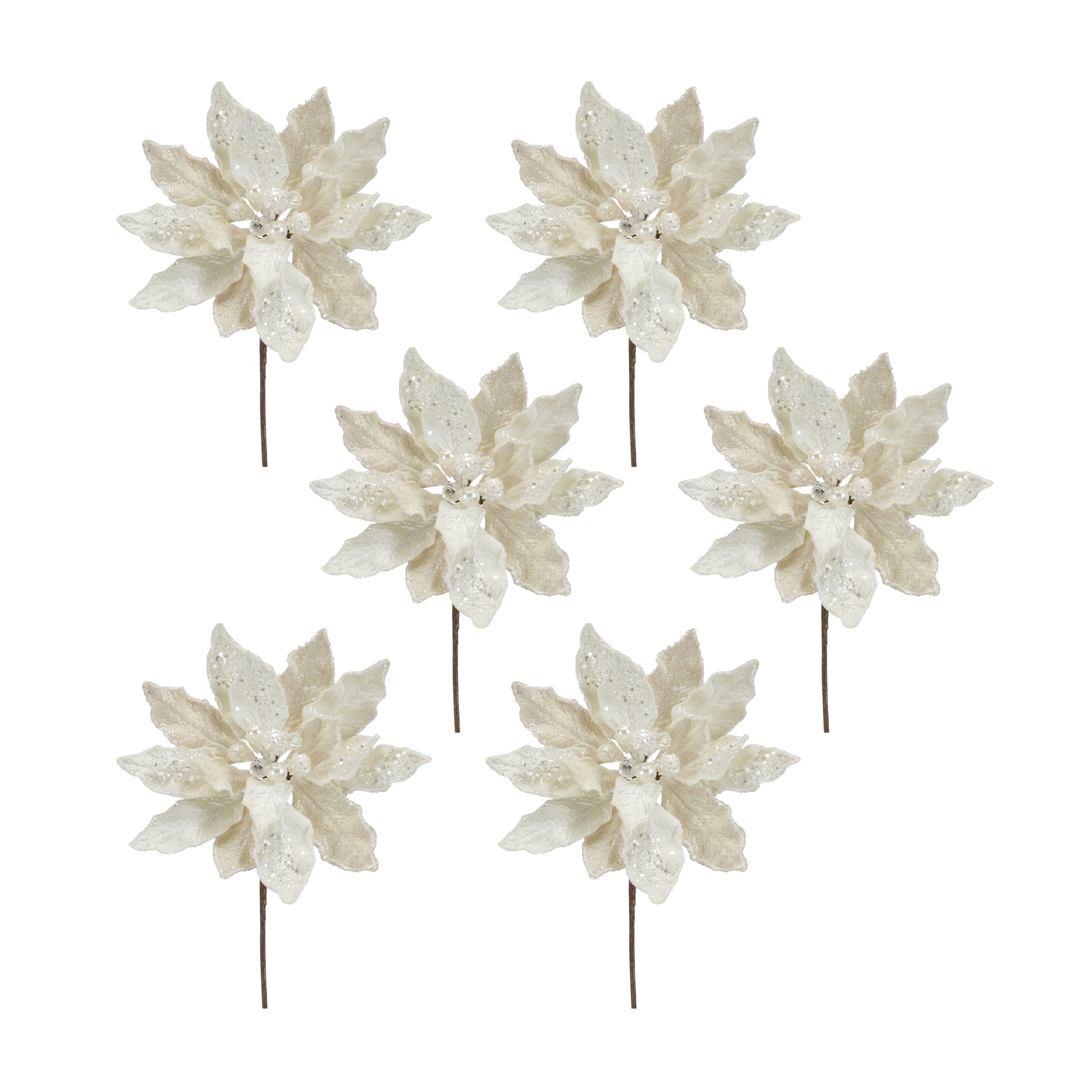 Ivory Velvet Poinsetta Stem with Gold Bead Accents (Set of 6)