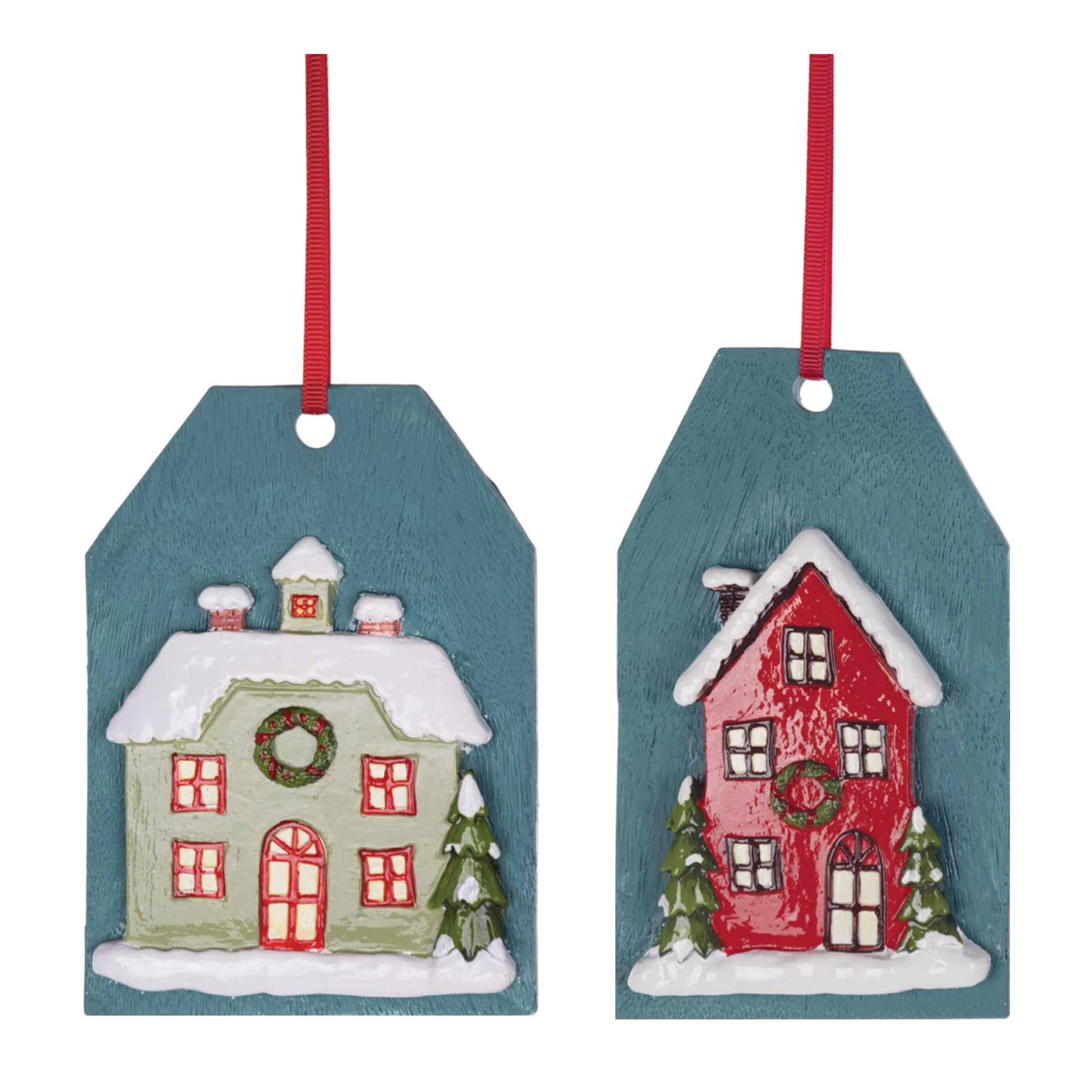 Celebrate the season with the Winter House Tag Ornament Set! These festive resin ornaments feature a charming snowy house design in vibrant red and blue hues, making them a perfect addition to your holiday tree or as a delightful gift for loved ones. Crafted with durable polyresin, these ornaments are built to last for years of seasonal joy. Whether you're decorating your home or spreading holiday cheer, these ornaments are sure to bring smiles to all. Sold in a set of six pieces with two assorted designs to create a balanced and versatile display on your Christmas tree.