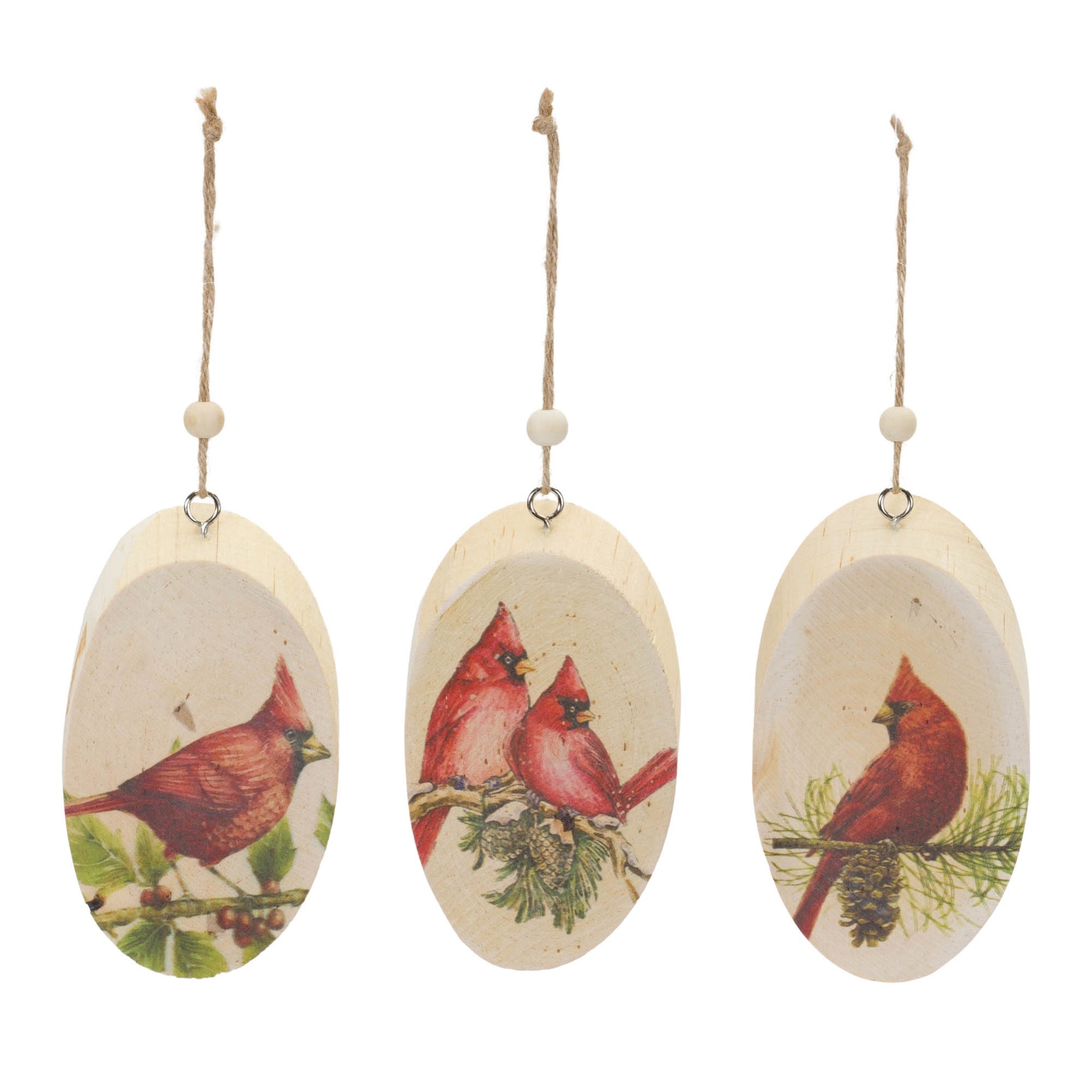 Bring a touch of nature-inspired charm to your holiday decor with this set of Wood Cardinal Disc Christmas Ornaments. Featuring beautifully painted cardinal bird designs on rustic wood discs, these ornaments add warmth and tradition to your Christmas tree. The natural wood finish, festive red accents, and delicate pine branch and bead embellishments create a cozy, handcrafted feel. Complete with durable jute hangers, these ornaments are perfect for enhancing your home's seasonal ambiance or gifting to a loved one. Sold in a set of 24 pieces with three assorted designs to create a balanced display on your Christmas tree.